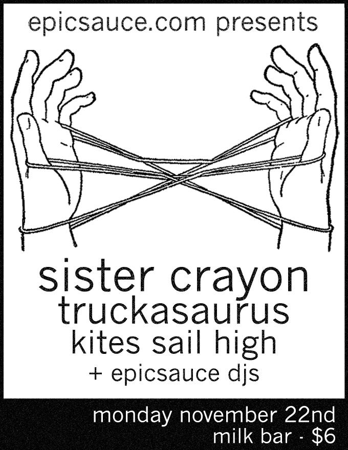Kevin at epicsauce.com is curating a great night of Monday night music at Milk Bar featuring Sacramento’s Sister Crayon, Seattle-based Truckasaurus, whose sophomore album just got a 8.2 on Pitchfork, and San Francisco’s Kites Sail High.