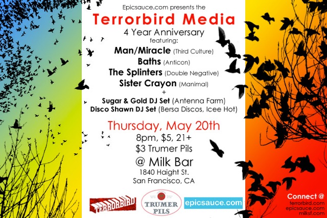 Terrorbird is turning 4 and Epicsauce is hosting a fine birthday bash for them tonight Thursday, May 20 at Milk Bar in the Haight (across from Amoeba) featuring a great line up including San Francisco’s Man/ Miracle, The Splinters, Sacramento’s Sister Crayonsand LA’s Baths. For $5 you just can’t beat it.