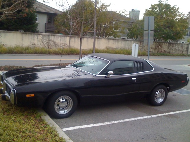 Seriously. I’m coveting muscle cars? What’s wrong with me! I’ve never done that before. First it was the little old lady in the pristine 1974 Ford Mustang taunting me every morning as I drive down Van Ness en route to work. Now this parks next to me on a daily basis, begging for my affection. Well, you have it pretty lady. Every time I see you I want to rip off my clothes and have hot, sweaty sex on your benchseat. And I didn’t even know your name. I do now. Dodge Charger. Year? You tell me.