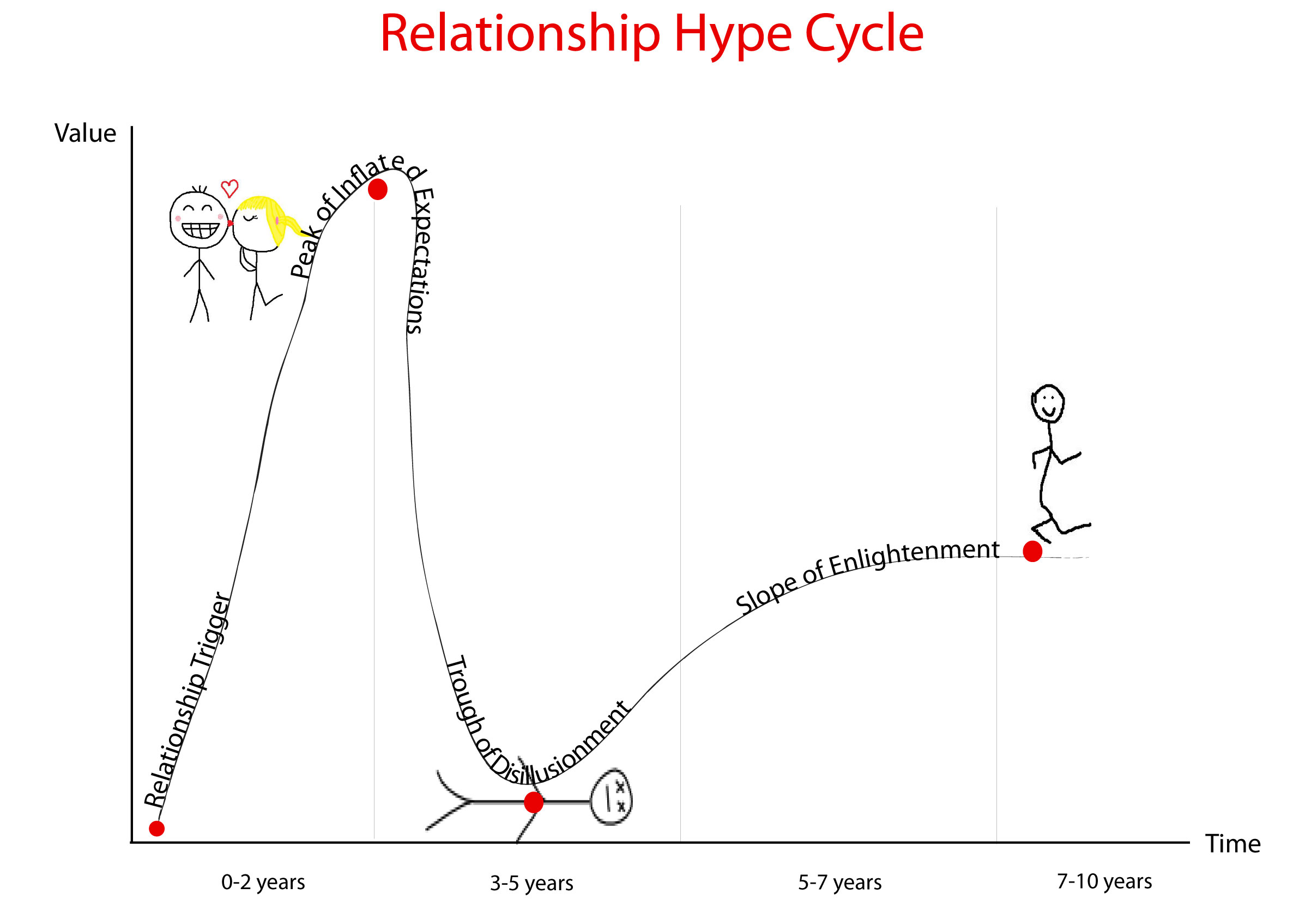 I’ve been studying way too many technology hype cycles lately, especially working in the mobile apps space where there’s lots and lots of growth, hype and expectation. I couldn’t help but muse recently the startling similarities between technology hype cycles and love relationships. It’s jaw dropping actually. See for yourself. Correlate these hype cycle phases with the amount of time currently invested in your own relationship and tell me….where are you in the relationship hype cycle? Scary, huh.
